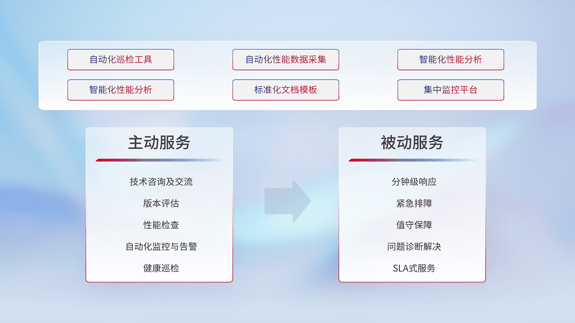 智能化工具和标准化文档,,,保障服务质量,,,,提供主动服务(包含技术咨询、、、、版本评估、、、性能检查、、、、自动化监控与告警、、、、健康巡检)和被动服务包含(分钟级响应、、紧急排障、、值守保障、、、、问题诊断解决、、SLA服务)。。。。