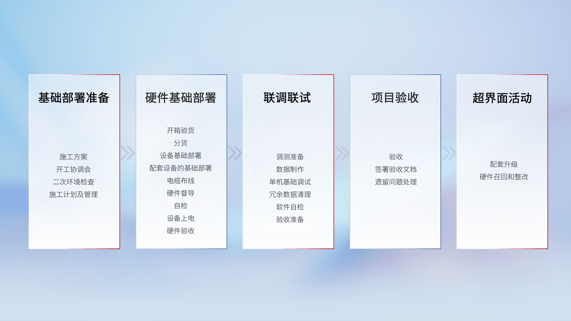 从基础部署准备、、硬件基础部署、、、、联调联试、、项目验收、、越界面活动的全过程可追溯,,,,保证施工质量和进度。。。。